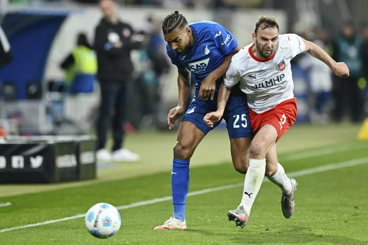 Hoffenheim's Kevin Akpoguma, left, and Heidenheim's Benedikt Gimber in action during the Bundesliga soccer match between TSG 1899 Hoffenheim and 1. FC Heidenheim at PreZero Arena, Sinsheim, Germany, Sunday March 9, 2025. (Uwe Anspach/dpavia AP)