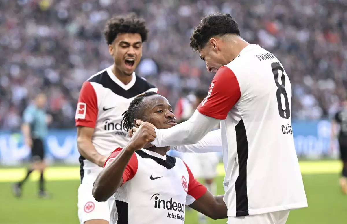 Frankfurt's Michy Batshuayi, center, celebrates with teammates Far's Chaibi, right and Nathaniel Brown after scoring a goal, during the German Bundesliga soccer match between Eintracht Frankfurt and 1. FC Union Berlin at Deutsche Bank Park, in Frankfurt, Germany, Sunday, March 9, 2025. (Arne Dedert/dpa via AP)
