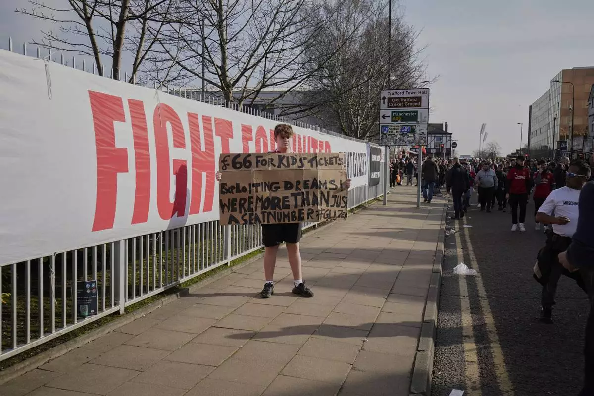 A Manchester United fan holds up a sign with concerns to ticket pricing prior to the English Premier League soccer match between Manchester United and Arsenal at Old Trafford stadium in Manchester, England, Sunday, March 9, 2025. (AP Photo/Dave Thompson)