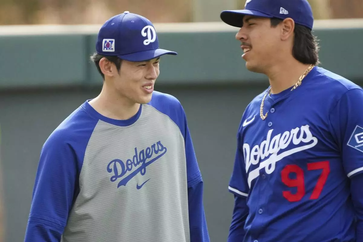 Los Angeles Dodgers pitcher Roki Sasaki, left, laughs with teammate Jose Rodriguez (97) as they stretch during spring training baseball practice, Wednesday, March. 5, 2025, in Phoenix. (AP Photo/Darryl Webb)