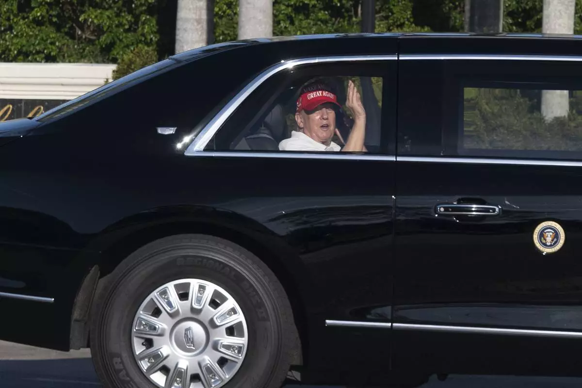 President Donald Trump waves from his limousine as he arrives at his golf club in West Palm Beach, Fla., Saturday, March 8, 2025, in West Palm Beach, Fla. (AP Photo/Manuel Balce Ceneta)