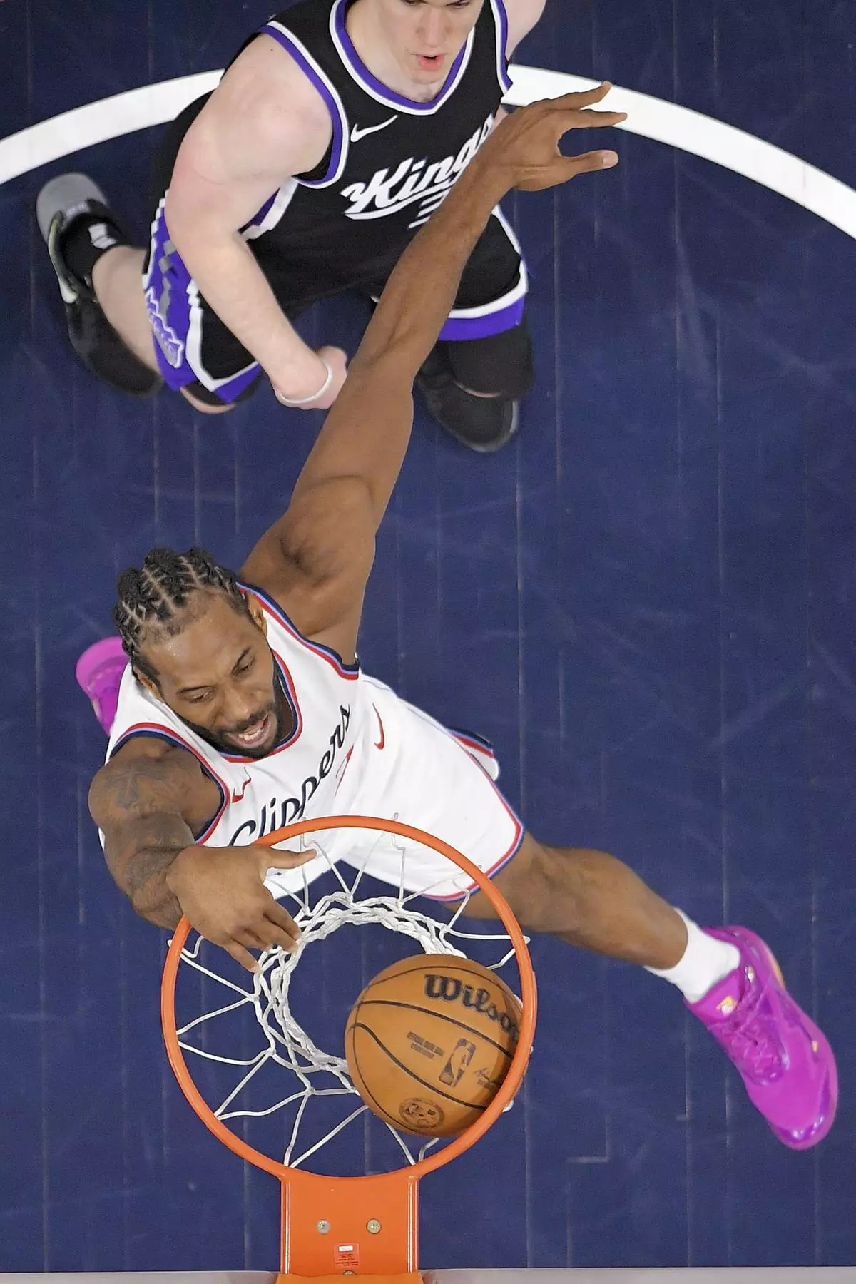 Los Angeles Clippers forward Kawhi Leonard, below, dunks as Sacramento Kings forward Jake LaRavia defends during the first half of an NBA basketball game Sunday, March 9, 2025, in Inglewood, Calif. (AP Photo/Mark J. Terrill)