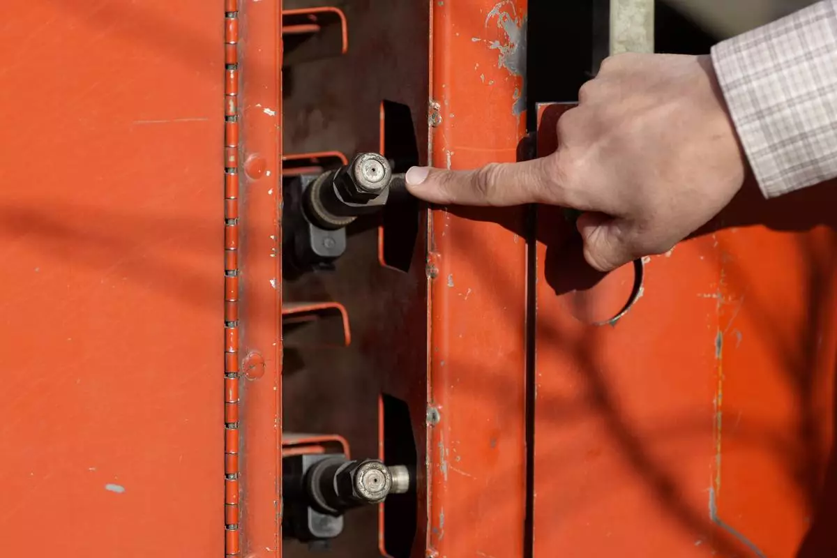 Tyler Klick, Partner/Viticulturist of Redwood Empire Vineyard Management, points toward a spray nozzle on a tank during an interview on AI technology used in the wine industry in Geyserville, Calif., Friday, Jan. 24, 2025. (AP Photo/Jeff Chiu)