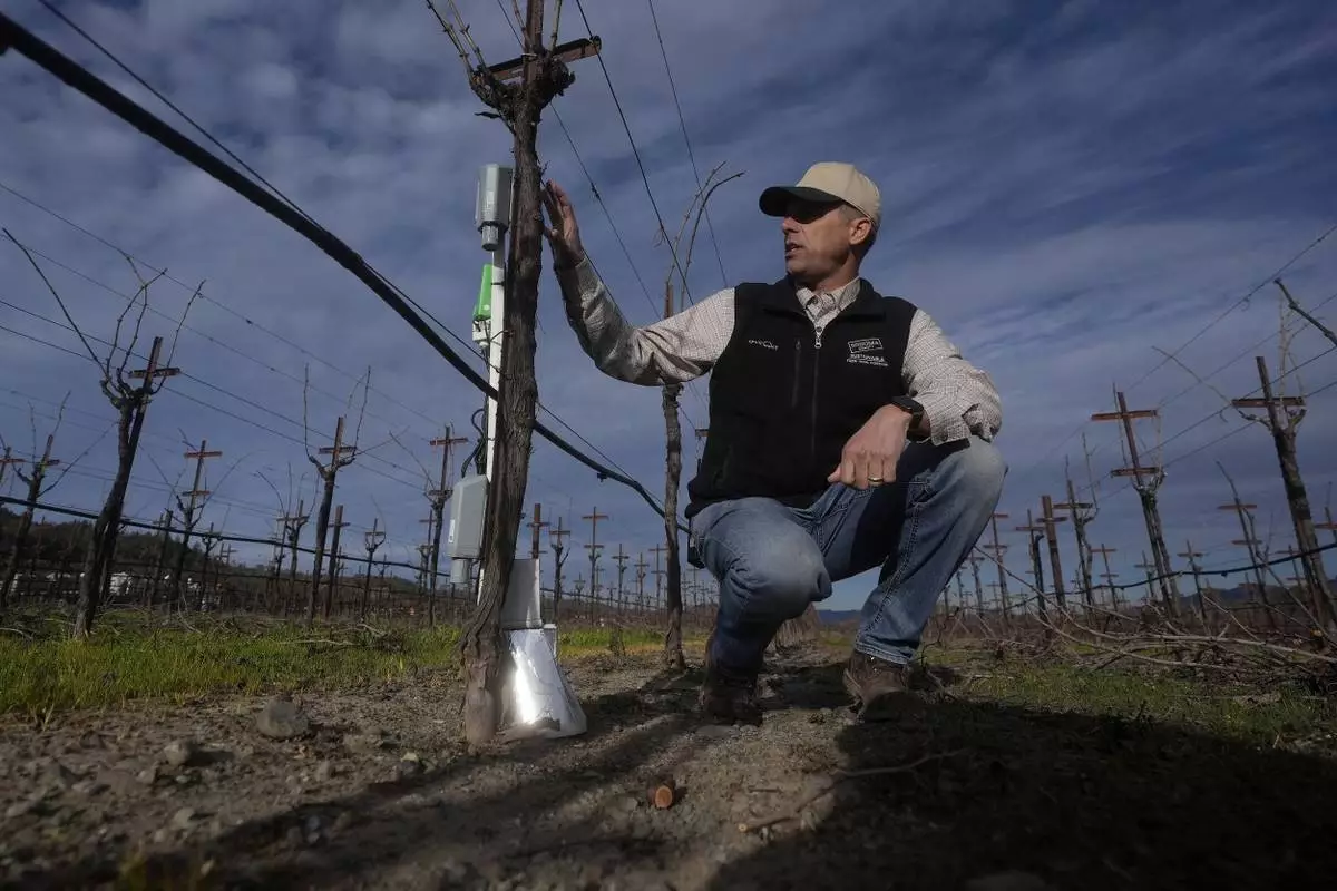 Tyler Klick, Partner/Viticulturist of Redwood Empire Vineyard Management, gestures toward an Agrology Arbiter system, which measures soil respiration, soil temperature and ambient temperature, during an interview on AI technology used in the wine industry in a Chardonnay production vineyard in Geyserville, Calif., Friday, Jan. 24, 2025. (AP Photo/Jeff Chiu)