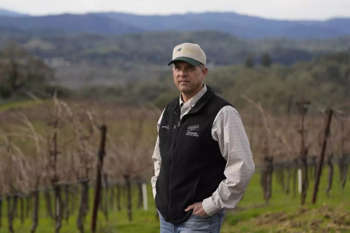 Tyler Klick, Partner/Viticulturist of Redwood Empire Vineyard Management, poses for photos while during an interview on AI technology being used in the wine industry in Geyserville, Calif., Friday, Jan. 24, 2025. (AP Photo/Jeff Chiu)