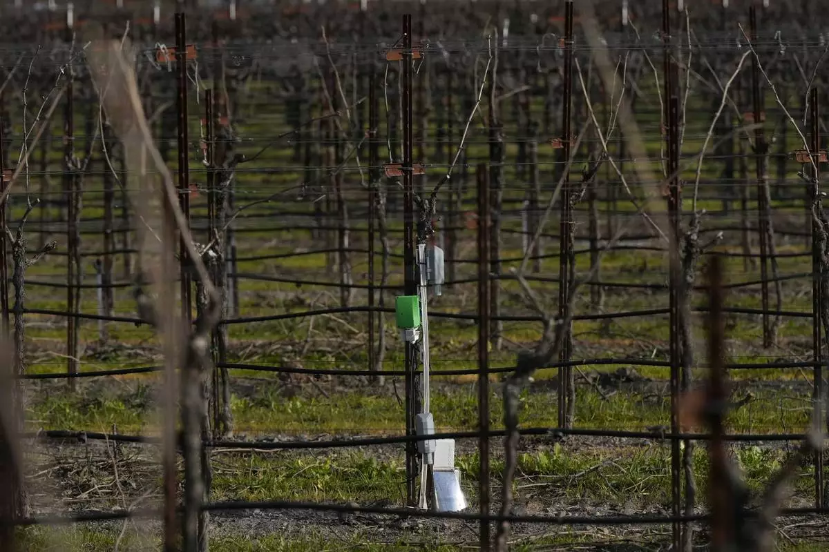 An Agrology Arbiter system, which measures soil respiration, soil temperature and ambient temperature, is shown in a Chardonnay production vineyard during an interview with Tyler Klick, Partner/Viticulturist of Redwood Empire Vineyard Management, in Geyserville, Calif., Friday, Jan. 24, 2025. (AP Photo/Jeff Chiu)