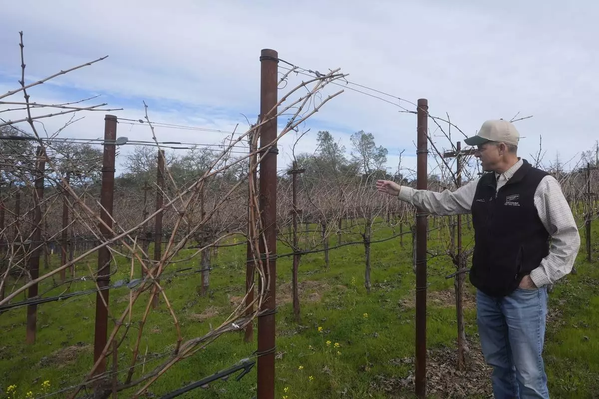 Tyler Klick, Partner/Viticulturist of Redwood Empire Vineyard Management, gestures toward a Cabernet Sauvignon vineyard during an interview in Geyserville, Calif., Friday, Jan. 24, 2025. (AP Photo/Jeff Chiu)
