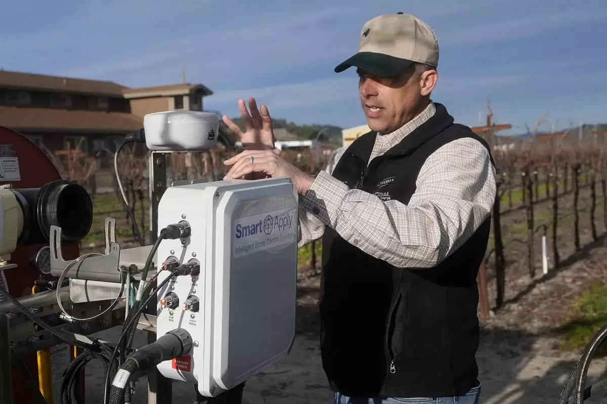 A NovAtel LiDAR device is shown above a Smart Apply Intelligent Spray Control System as Tyler Klick, Partner/Viticulturist of Redwood Empire Vineyard Management, during an interview on AI technology used in the wine industry in Geyserville, Calif., Friday, Jan. 24, 2025. (AP Photo/Jeff Chiu)
