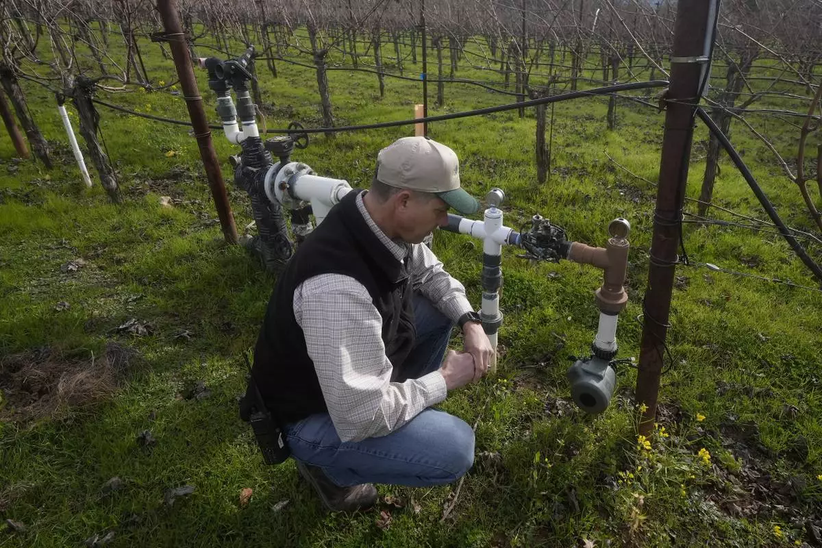 Tyler Klick, Partner/Viticulturist of Redwood Empire Vineyard Management, looks toward a Lumo smart irrigation valve in a Cabernet Sauvignon vineyard during an interview in Geyserville, Calif., Friday, Jan. 24, 2025. (AP Photo/Jeff Chiu)