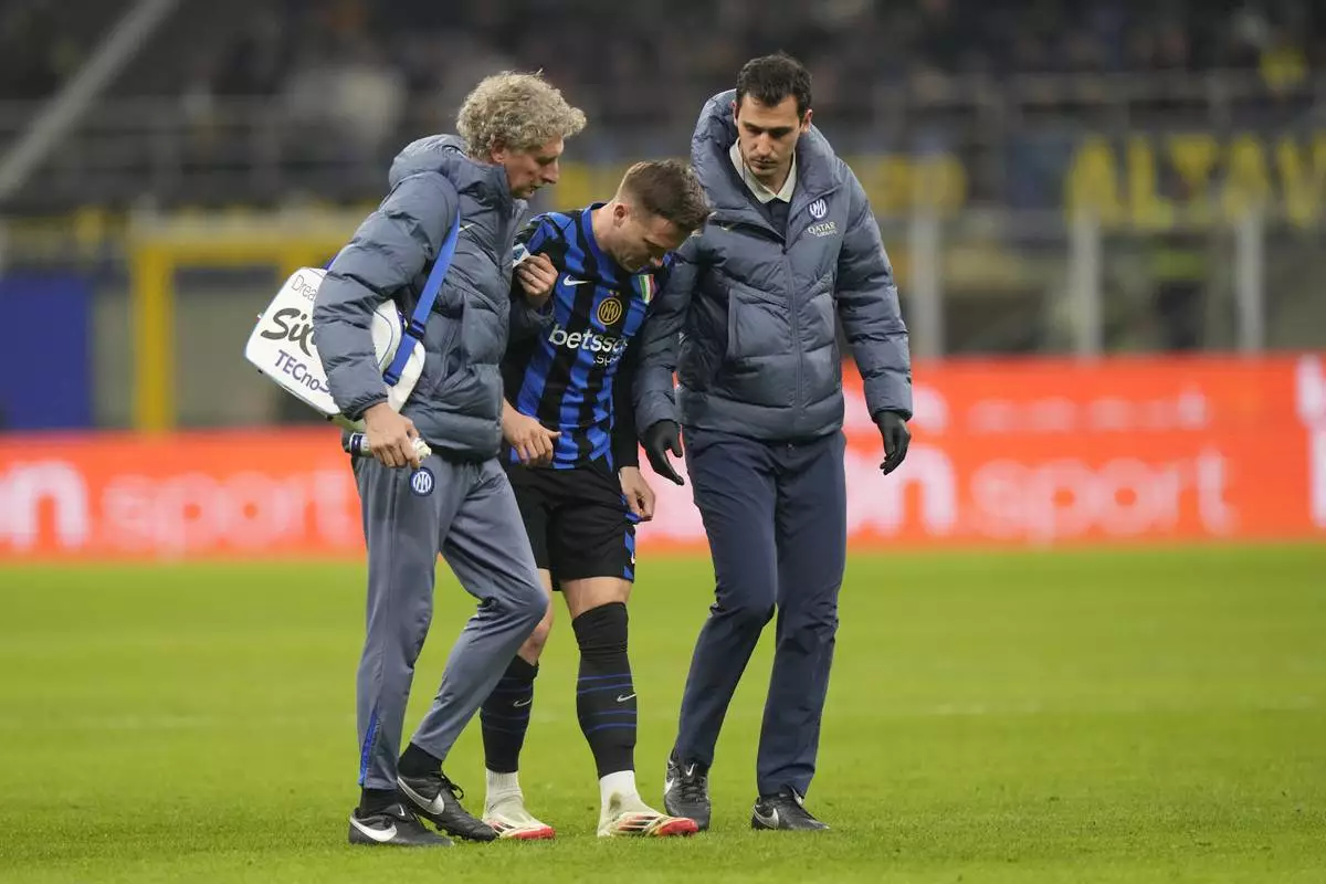 Inter Milan's Piotr Zielinski, centre, leaves the pitch after an injury during the Serie A soccer match between Inter Milan and Monza at the San Siro stadium in Milan, Italy, Saturday, March 8, 2025. (AP Photo/Luca Bruno)