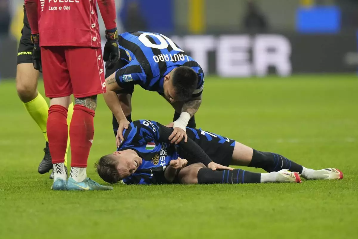 Inter Milan's Lautaro Martinez, centre, checks as Piotr Zielinski lies on the pitch in pain during the Serie A soccer match between Inter Milan and Monza at the San Siro stadium in Milan, Italy, Saturday, March 8, 2025. (AP Photo/Luca Bruno)