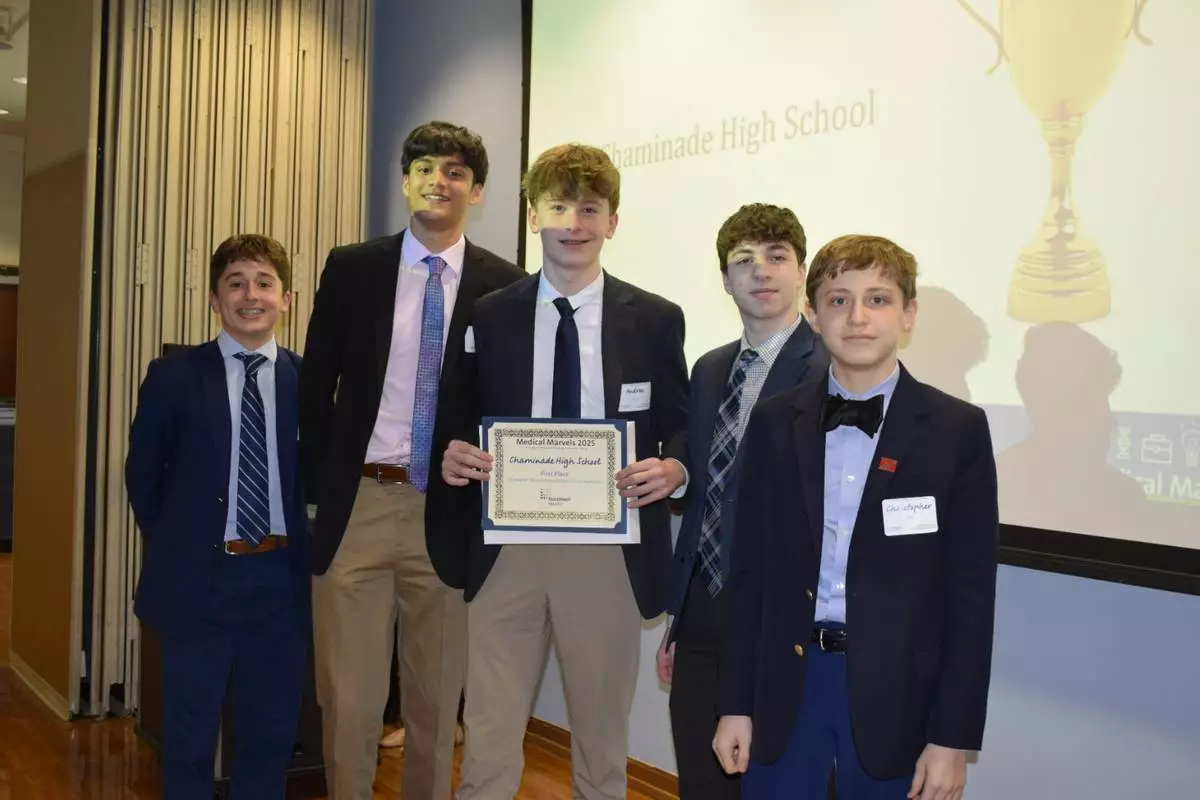Chaminade High School students earned the title “Medical Marvels” at the 13th annual STEM (science, technology, engineering, and math) research competition, hosted by Northwell Health’sThe Feinstein Institutes for Medical Research and Career Services. More than 180 freshmen and sophomores from Long Island and New York City entered the competition by submitting research papers and presentations focused on ways to better educate others on the effects of social media use and mental health. The winning team was announced on Feb. 28, following final presentations at the Feinstein Institutes headquarters in Manhasset, NY.