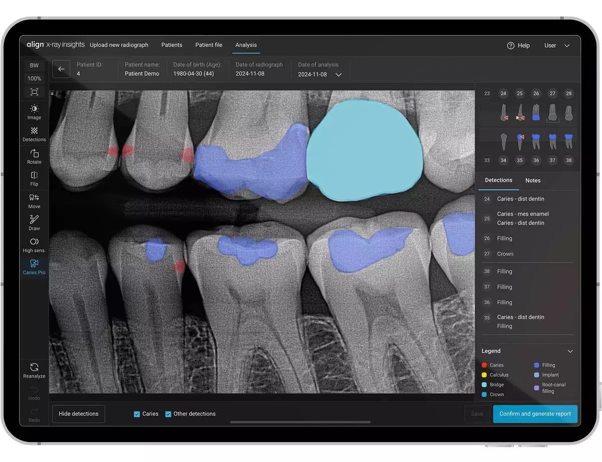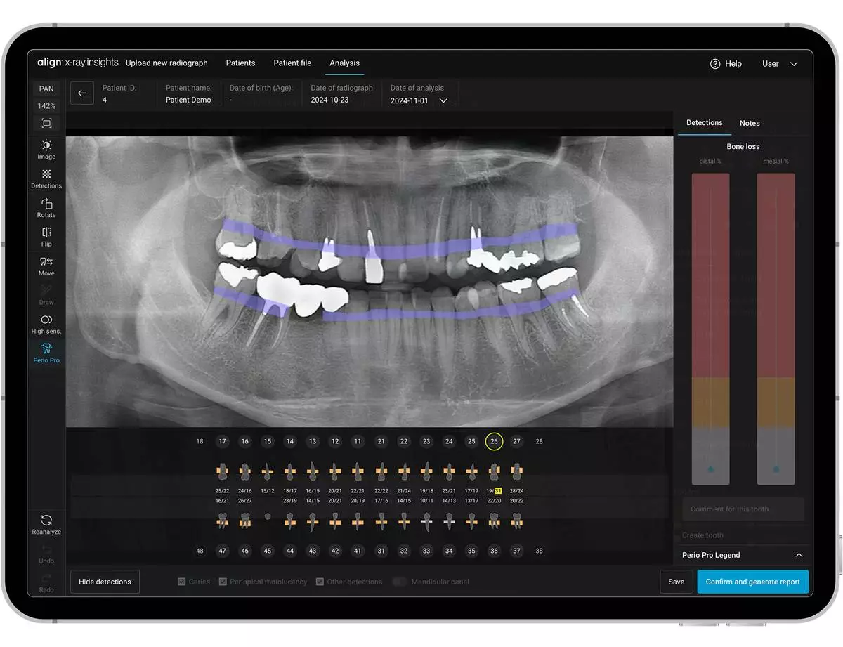 After confirming diagnosis, doctors can use the Align X-ray Insights detailed report, automatic tooth charting, and color overlays of radiographic abnormalities for patient education and treatment planning. The AI detection functionalities include caries, periapical radiolucencies and periodontal bone loss and other conditions.