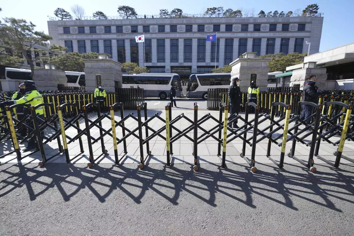 FILE - South Korean police officers stand guard in front of the Constitutional Court in Seoul, South Korea, on Feb. 18, 2025. (AP Photo/Lee Jin-man, File)