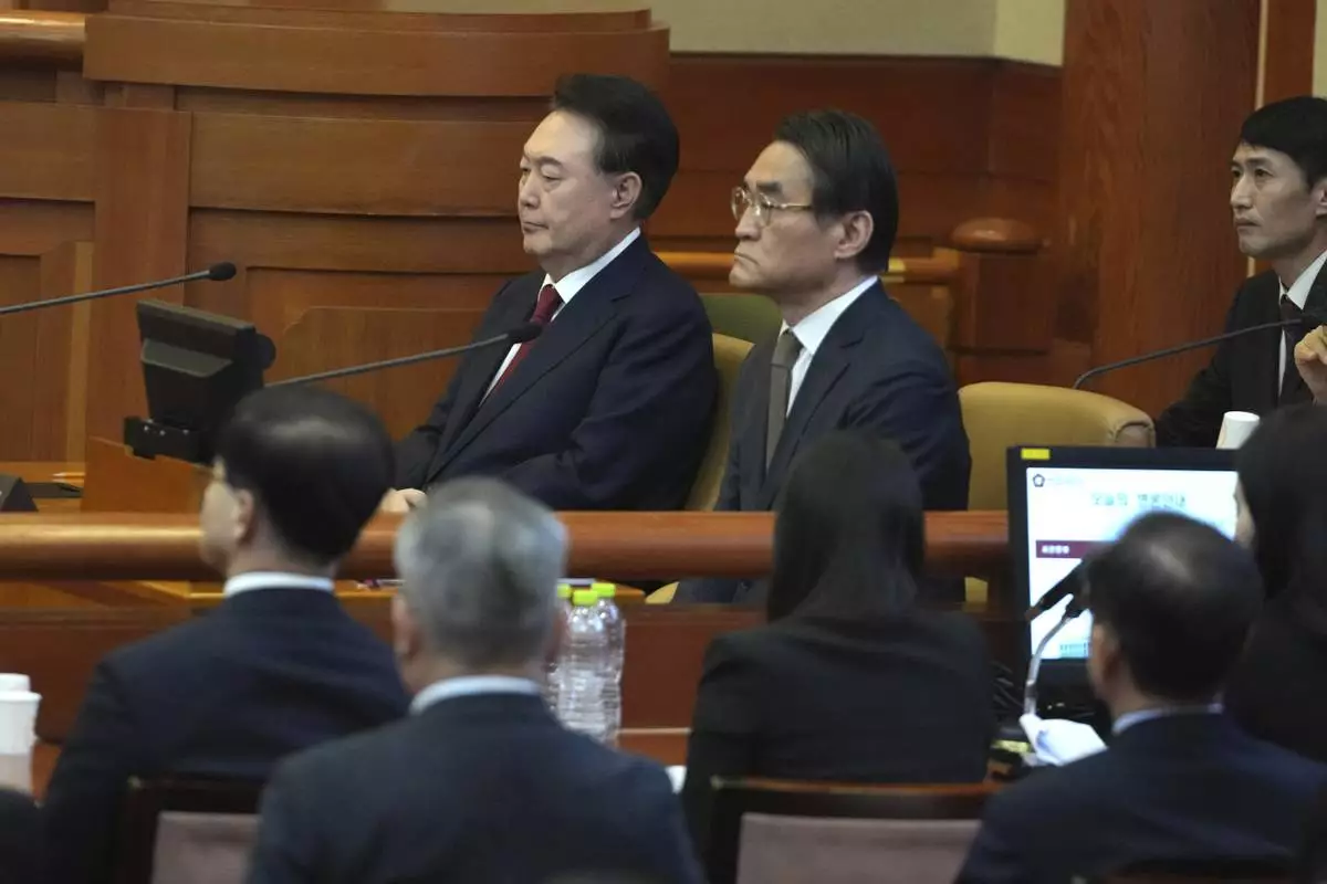 FILE - South Korea's impeached President Yoon Suk Yeol attends a hearing of his impeachment trial at the Constitutional Court in Seoul, South Korea, Tuesday, Feb. 11, 2025. (AP Photo/Lee Jin-man, Pool, File)