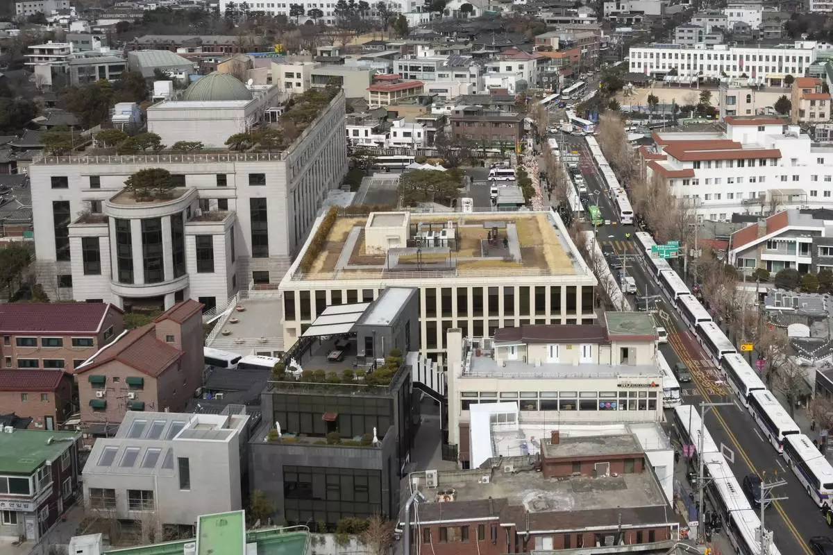 FILE - Police buses are parked to make walls on the road as part of preparations for an eventuality near the Constitutional Court, top left, in Seoul, South Korea, on Feb. 25, 2025. (AP Photo/Ahn Young-joon, File)