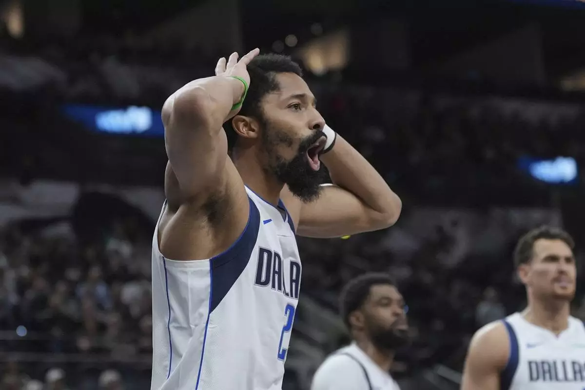 Dallas Mavericks guard Spencer Dinwiddie (26) reacts to a call during the second half of an NBA basketball game against the San Antonio Spurs in San Antonio, Monday, March 10, 2025. (AP Photo/Eric Gay)