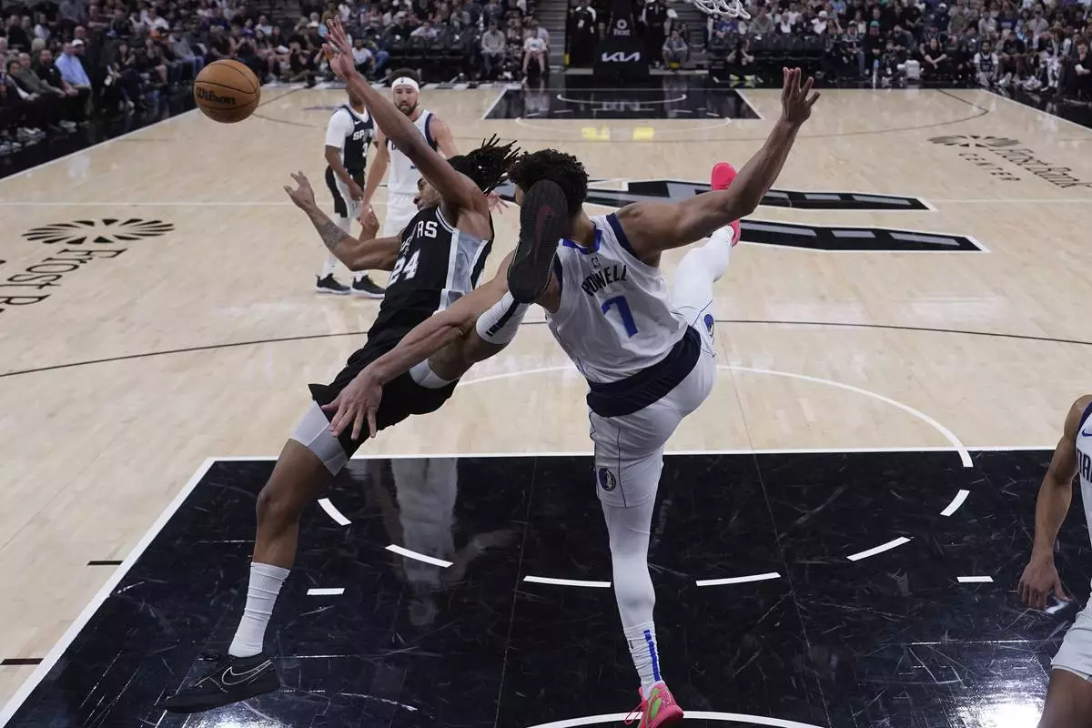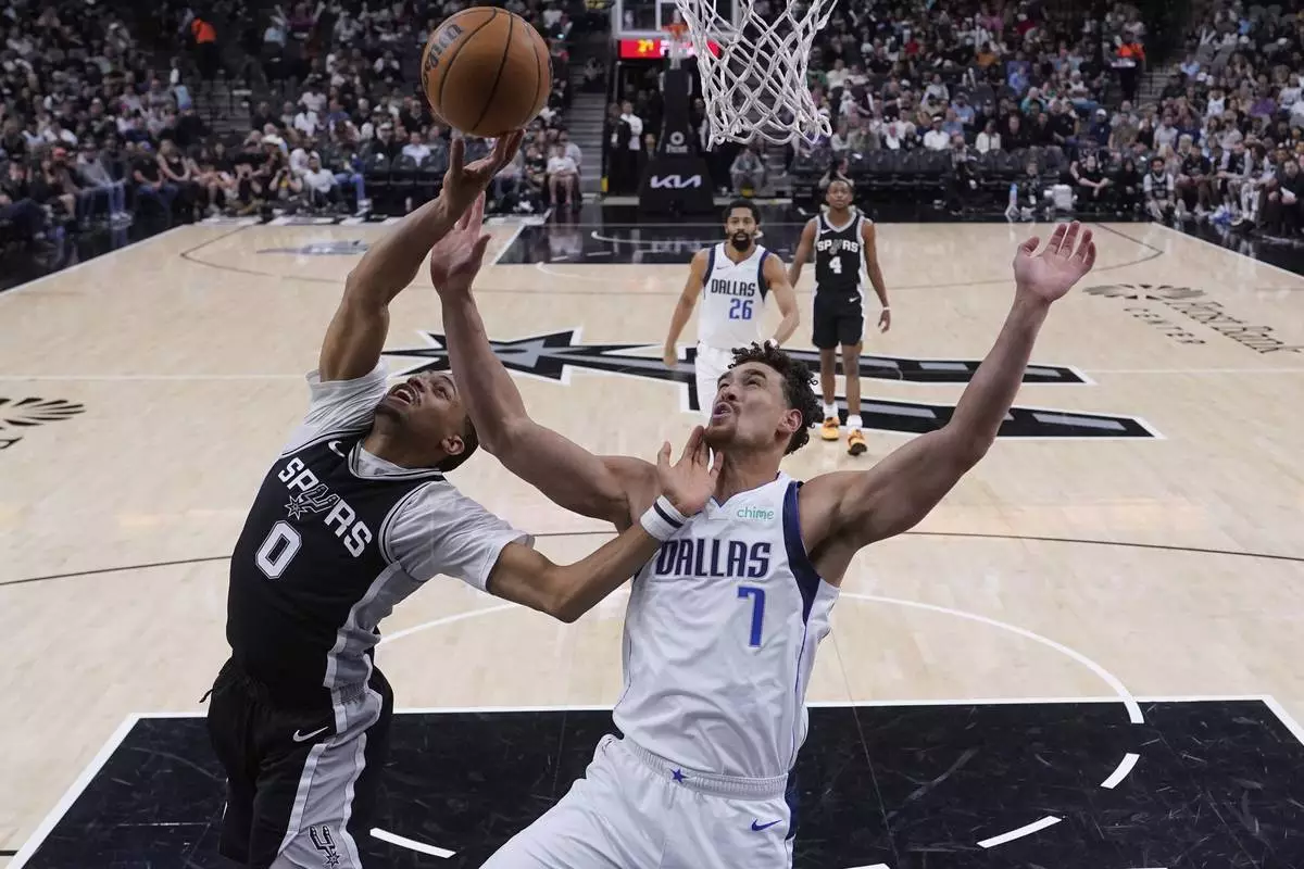 San Antonio Spurs guard Devin Vassell (24) is blocked by Dallas Mavericks center Dwight Powell (7) as he drives to the basket during the second half of an NBA basketball game in San Antonio, Monday, March 10, 2025. (AP Photo/Eric Gay)
