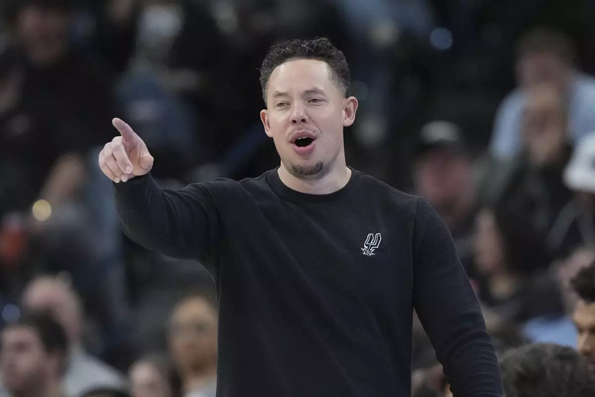 San Antonio Spurs acting head coach Mitch Johnson signals to his players during the second half of an NBA basketball game against the Dallas Mavericks in San Antonio, Monday, March 10, 2025. (AP Photo/Eric Gay)
