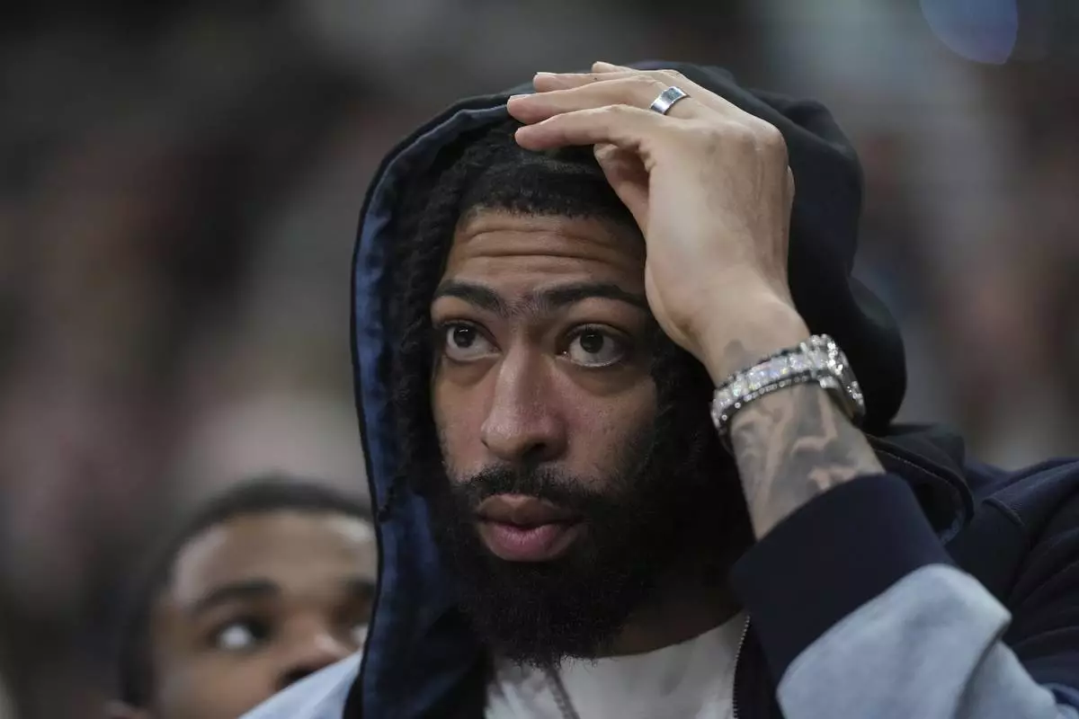 Dallas Mavericks forward Anthony Davis watches from the bench during the second half of an NBA basketball game against the San Antonio Spurs in San Antonio, Monday, March 10, 2025. (AP Photo/Eric Gay)