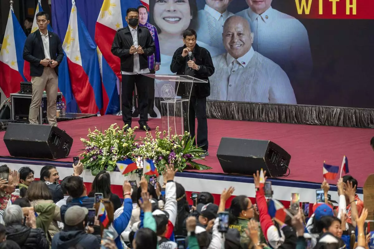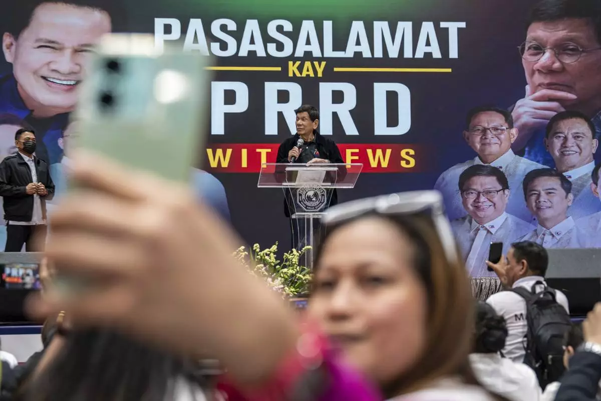 Former President of the Philippines Rodrigo Duterte speaks inside the Southorn Stadium during a thanksgiving gathering organized by Hong Kong-based Filipino workers for the former populist president in Hong Kong on Sunday, March 9, 2025. (AP Photo/Vernon Yuen)