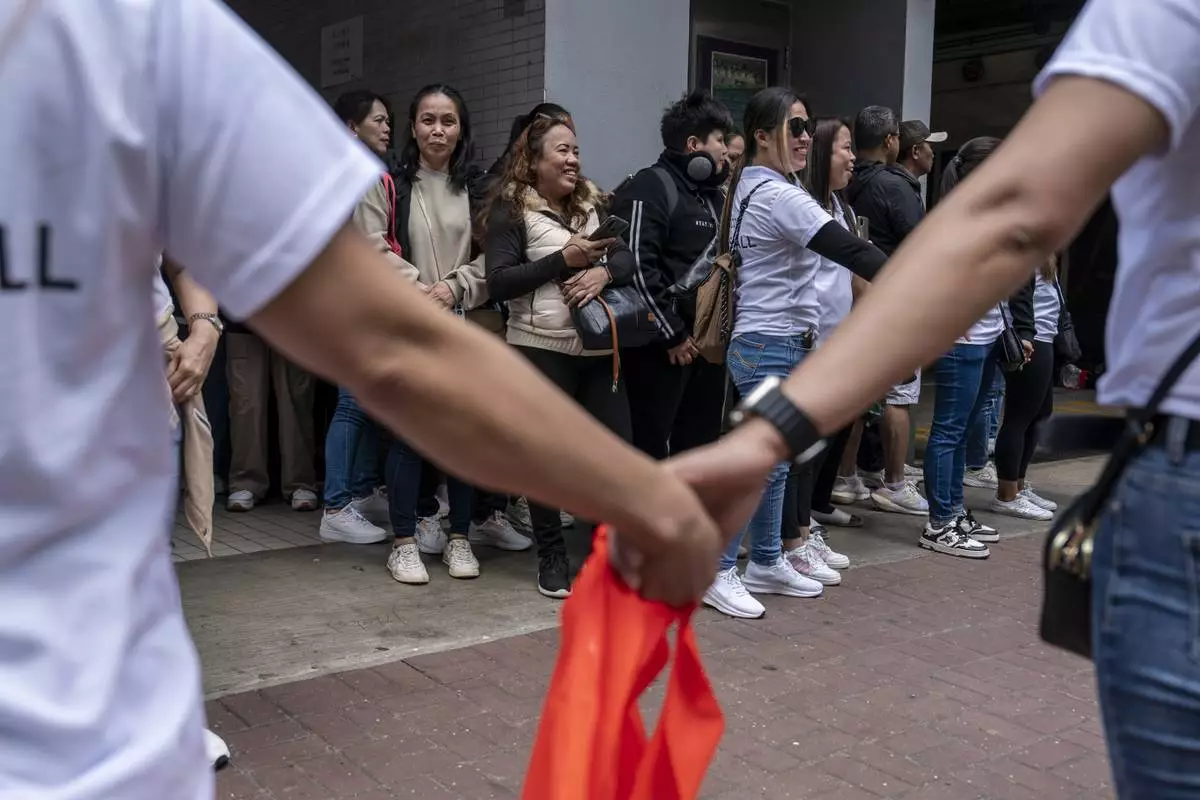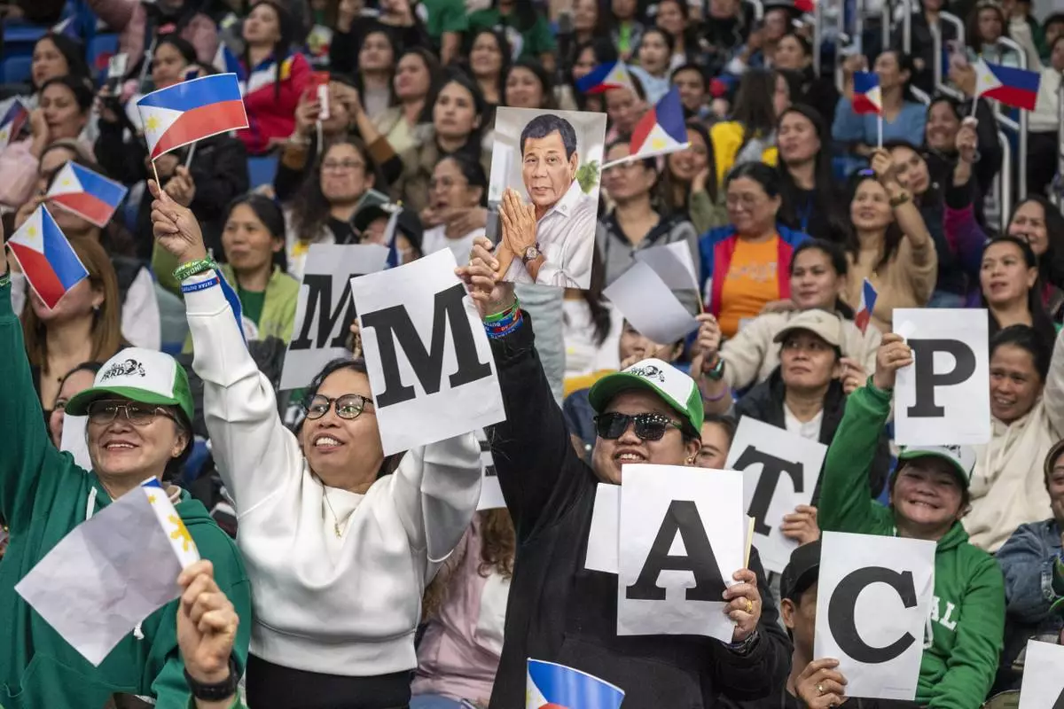 Supporters of former populist President of the Philippines Rodrigo Duterte waits for his arrival at a thanksgiving gathering organized by Hong Kong-based Filipino workers in Hong Kong on Sunday, March 9, 2025. (AP Photo/Vernon Yuen)