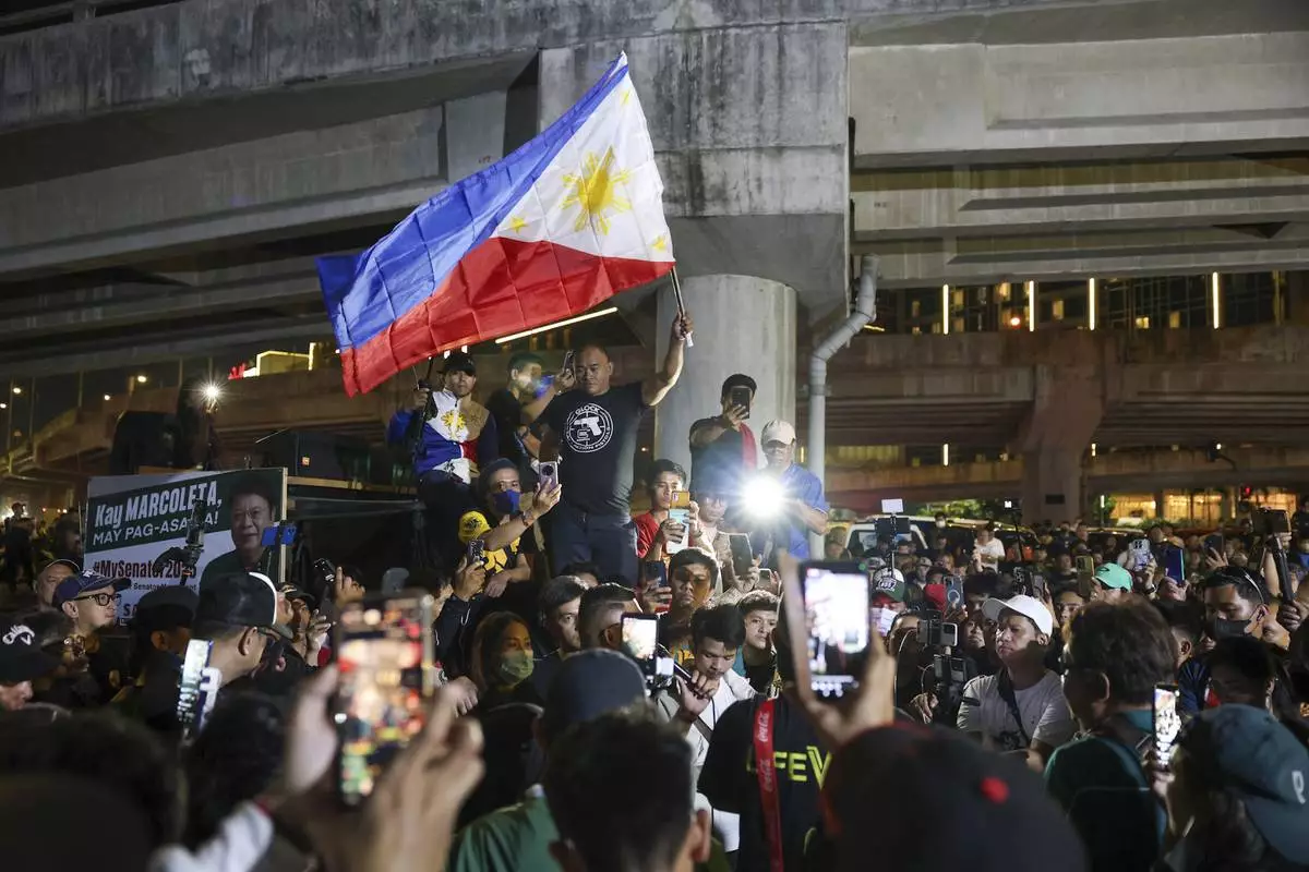 Supporters rally outside Villamor Air Base after former President Rodrigo Duterte was arrested, Tuesday, March 11, 2025, near Manila, Philippines. (AP Photo/Aaron Favila)