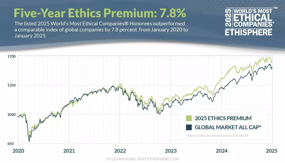 Ethisphere’s Five-Year Ethics Premium for 2025 is 7.8%. This represents the margin by which publicly traded companies recognized in this year’s World’s Most Ethical Companies outperformed a comparable index of global companies over a five-year period from January 2020 to January 2025.