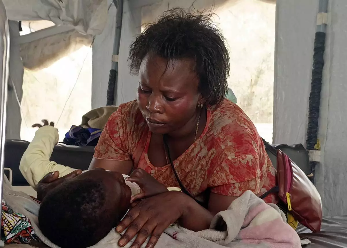 Christine Masumbuko leans over her child suffering from Mpox at the Miti Murhesa hospital, some 25kms from Bukavu, Democratic Republic of the Congo, Thursday, March 6, 2025. (AP Photo/Janvier Barhahiga)