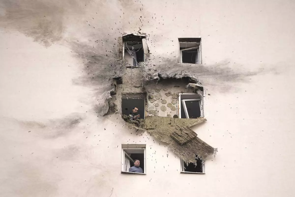 Investigators look at the damage of an apartment building where the downed Ukrainian drone fell in Sapronovo village outside Moscow, Russia, on Tuesday, March 11, 2025. (AP Photo)