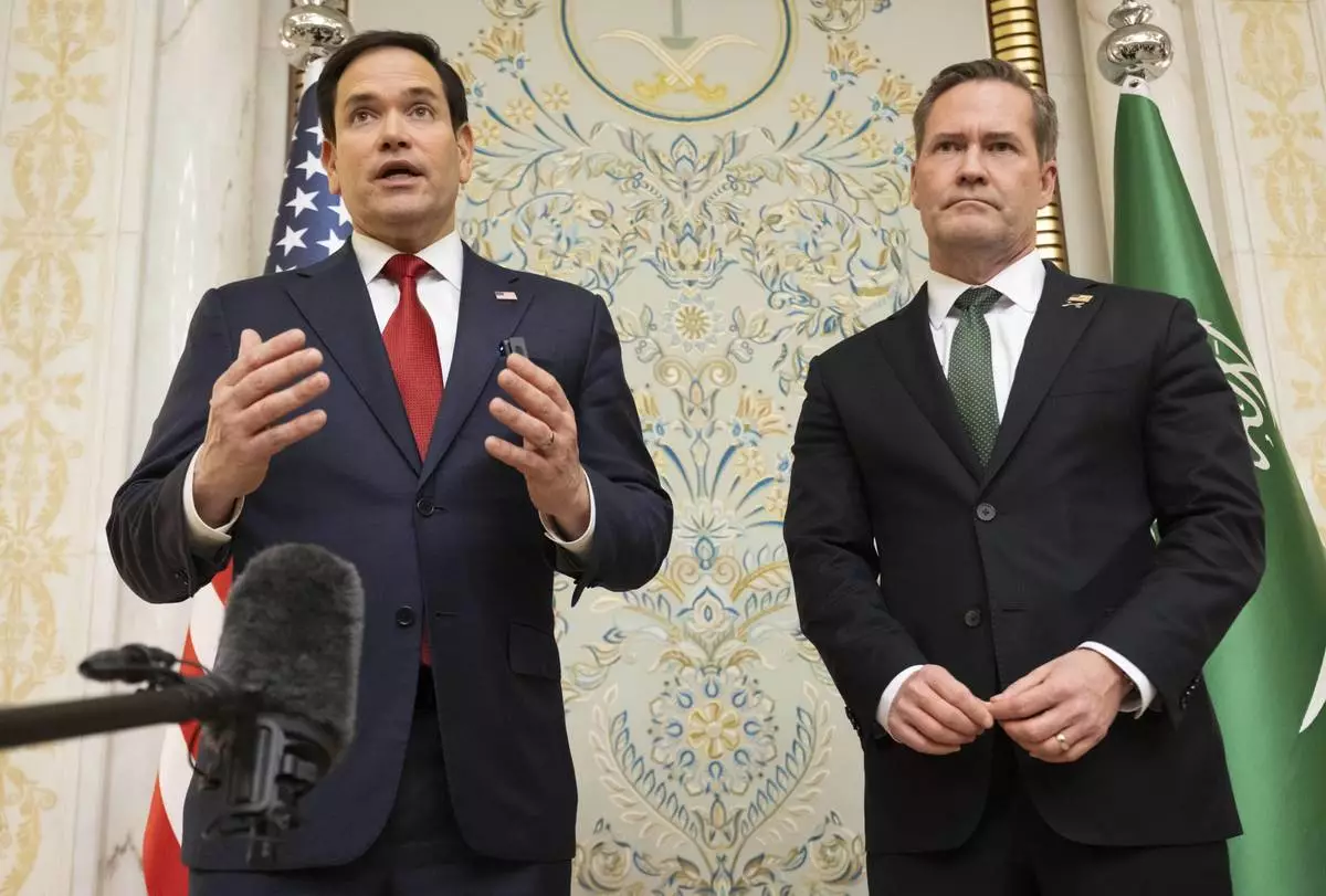 U.S. Secretary of State Marco Rubio, left, and U.S. National Security Advisor Mike Waltz speak with the media following meetings with a Ukrainian delegation in Jeddah, Saudi Arabia, March 11, 2025. (Saul Loeb/Pool Photo via AP)