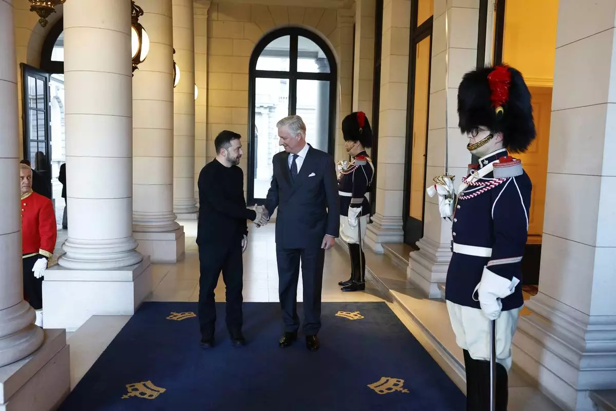 Belgium's King Philippe, right, greets Ukraine's President Volodymyr Zelenskyy prior to a meeting at the Royal Palace in Brussels, Thursday, March 6, 2025. (AP Photo/Stephanie Lecocq, Pool Photo via AP)