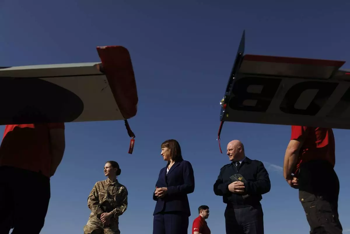 Britain's Chancellor of the Exchequer Rachel Reeves looks on during a visit to RAF Northolt to meet with UK defence suppliers to Ukraine, in North West London, Thursday March 6, 2025. (Dan Kitwood/PA via AP)
