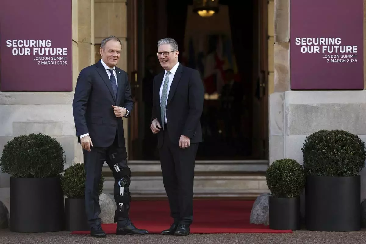 Britain's Prime Minister Keir Starmer, right, welcomes Poland Prime Minister Donald Tusk to the European leaders' summit to discuss Ukraine, at Lancaster House, London, Sunday March 2, 2025. (Toby Melville/Pool via AP)