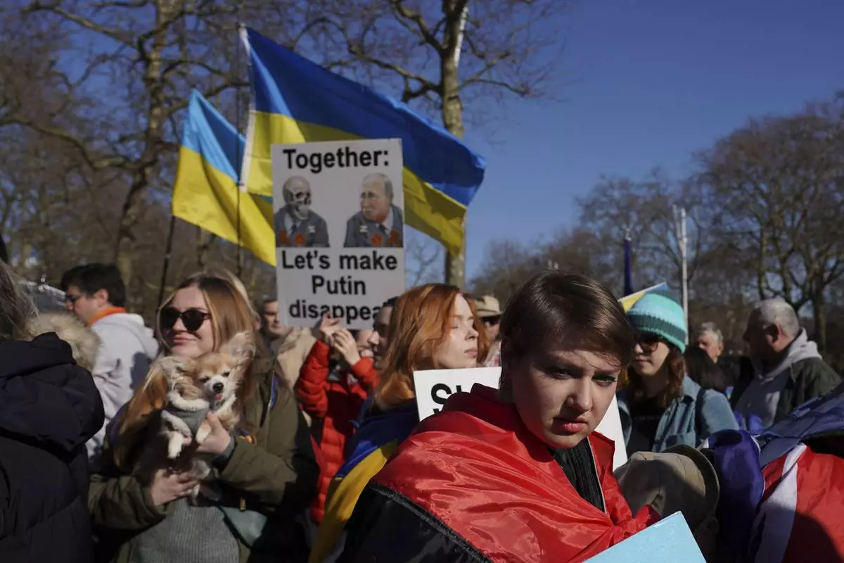 Ukrainian supporters waving flags pictures and banners demonstrate as they walk down the Mall as Britain's Prime Minister Keir Starmer chairs a Ukraine Summit at Lancaster House in London, Sunday, March 2, 2025. (AP Photo/Alberto Pezzali)