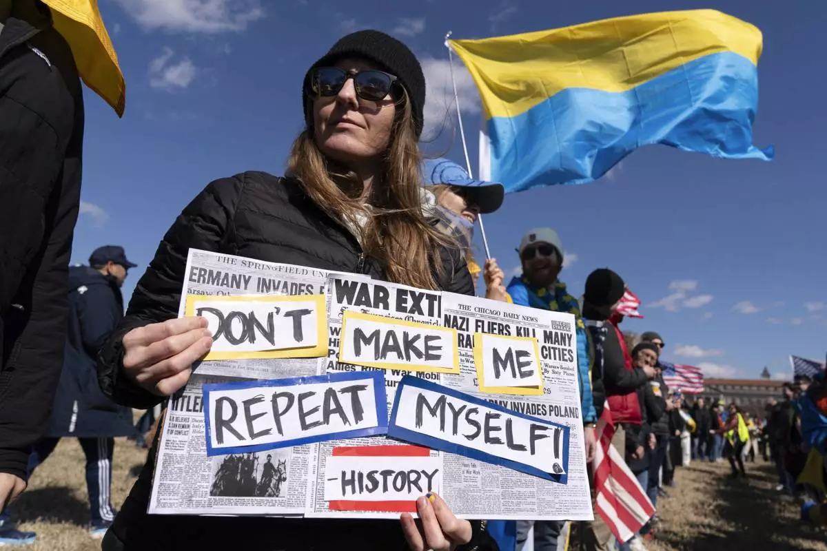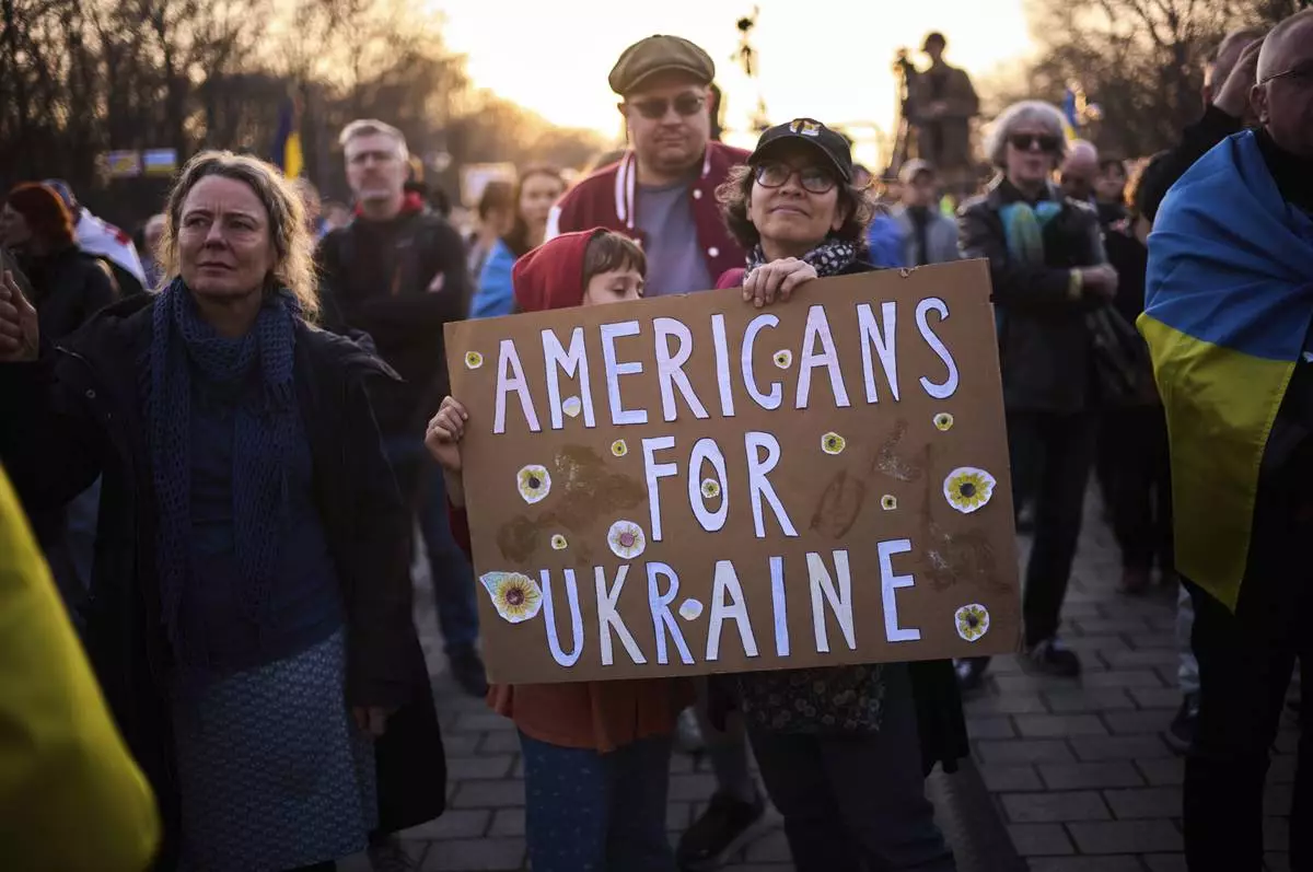 Demonstrators protest during a rally in support of Ukraine at The Ellipse near the White House in Washington, Saturday, March 8, 2025. (AP Photo/Jose Luis Magana)