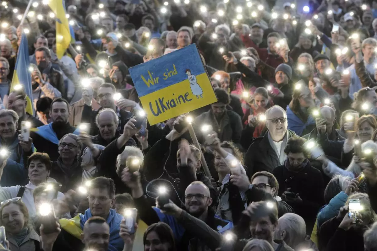 People hold up cell phone lights as they take part in a demonstration against Russia's war on Ukraine, in Berlin, Germany, Sunday, March 9, 2025. (AP Photo/Markus Schreiber)