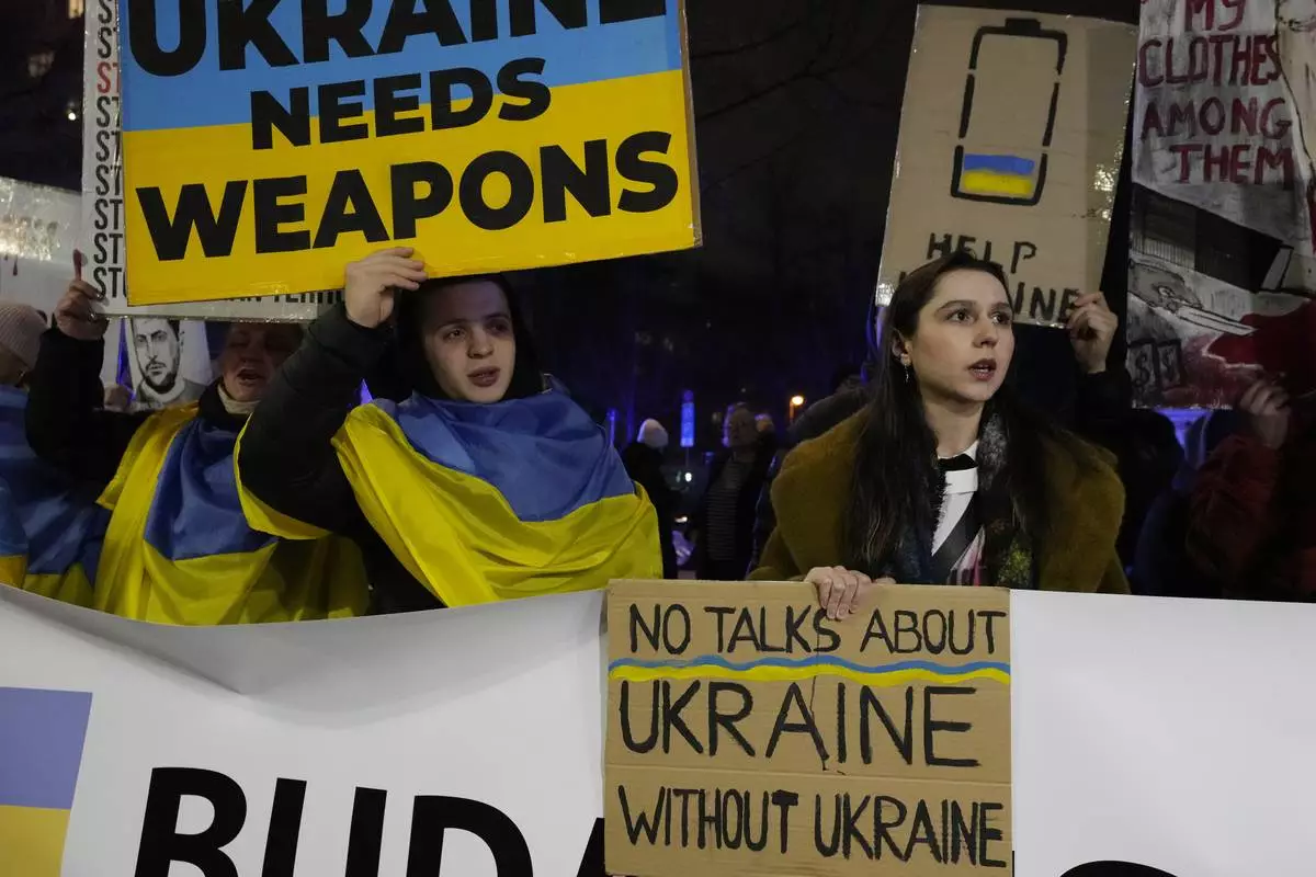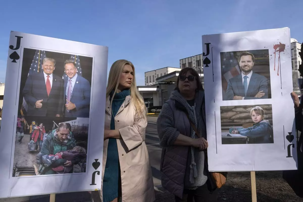 People hold a demonstration in support of Ukraine outside the U.S. Embassy in Warsaw, Poland, on Monday March 3, 2025. (AP Photo/Czarek Sokolowski)