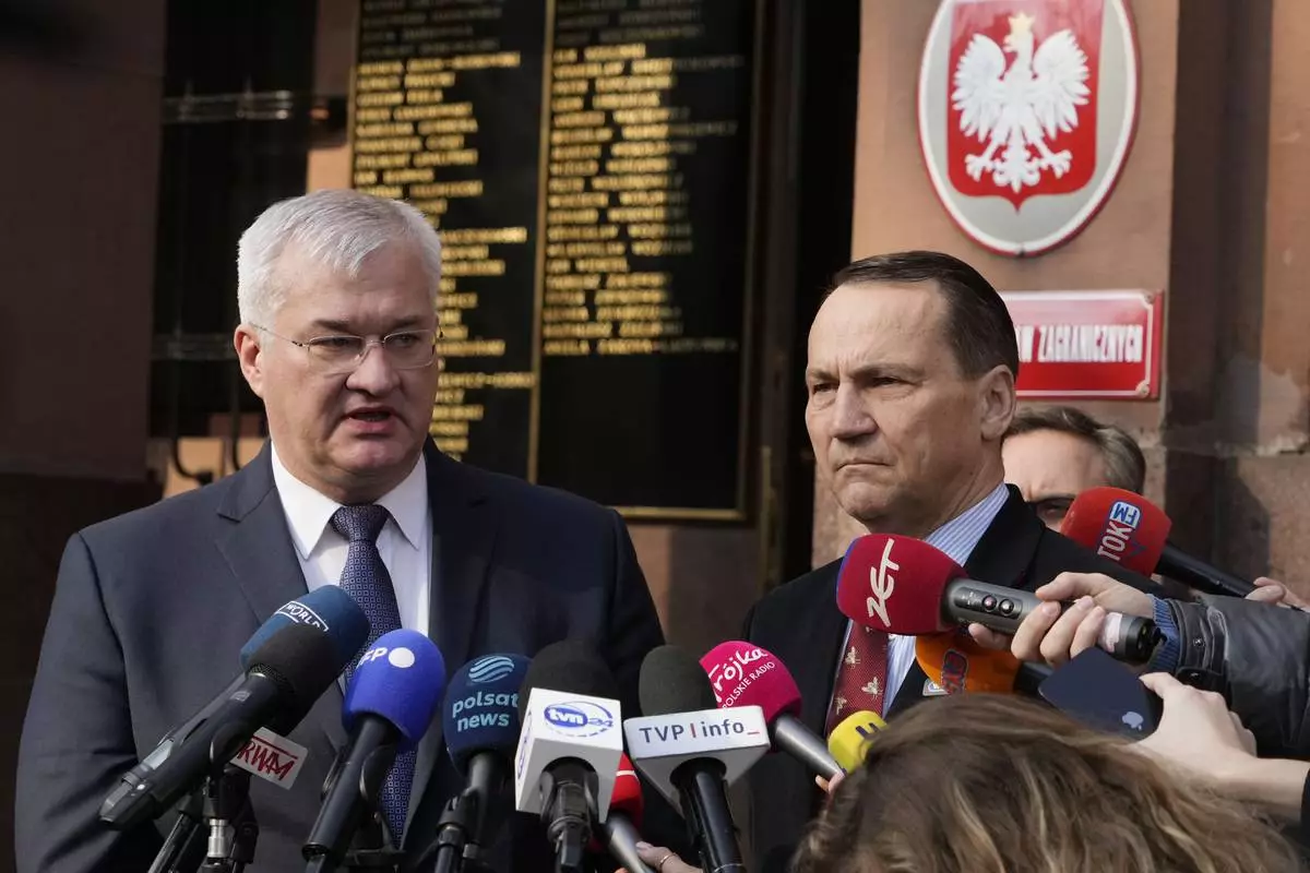 Ukrainian Foreign Minister Andrii Sybiha, left, and Polish Foreign Minister Radek Sikorski, right, address the media during press conference in Warsaw, Poland, Wednesday, March 12, 2025. (AP Photo/Czarek Sokolowski)