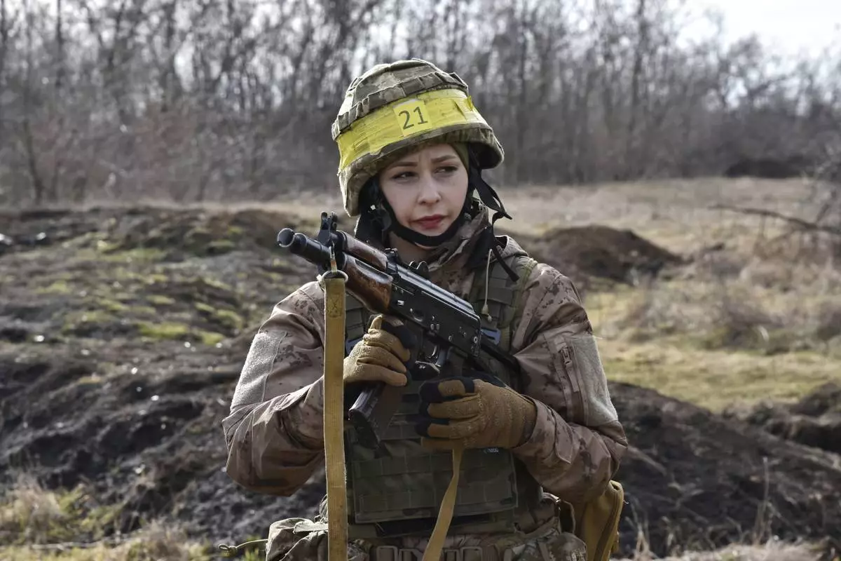 In this photo provided by Ukraine's 65th Mechanised Brigade press service, Ukrainian servicewoman, Daria, 36, practices at a military training ground in the Zaporizhzhia region, Ukraine, Monday, March 10, 2025. (Andriy Andriyenko/Ukraine's 65th Mechanised Brigade via AP)