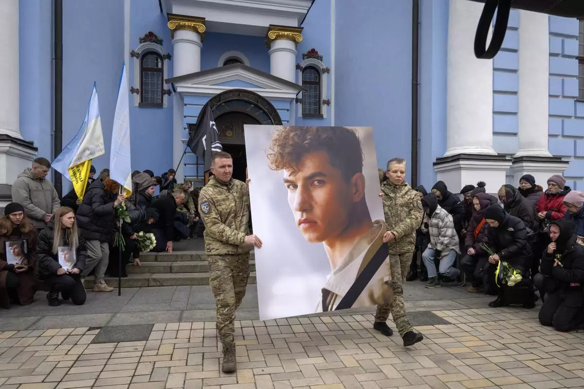 People stand kneeling as servicemen carry portrait of volunteer soldier Volodymyr Rakov, 30, a well known dancer and choreographer who was killed in the Russia Ukraine war, during the farewell ceremony at St.Michael Cathedral in Kyiv, Ukraine, Sunday, March 2, 2025. (AP Photo/Efrem Lukatsky)