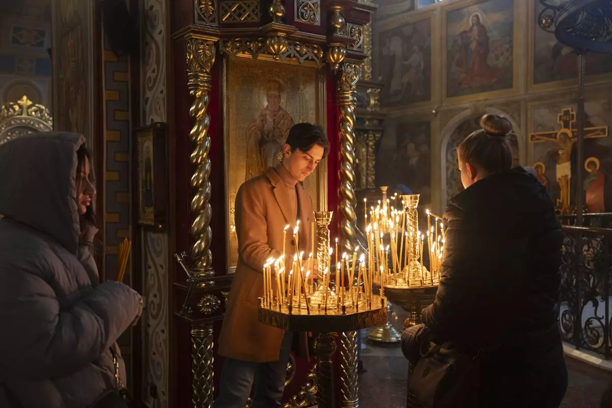 People light candles as they pray for peace in St.Michael Cathedral in Kyiv, Ukraine, Sunday, March 2, 2025. (AP Photo/Efrem Lukatsky)
