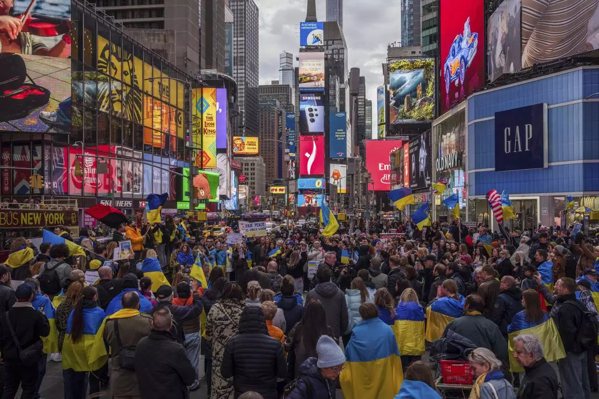 Members of the New York Ukrainian community and supporters gather in Times Square, Saturday, March 1, 2025 in New York. (AP Photo/Adam Gray)