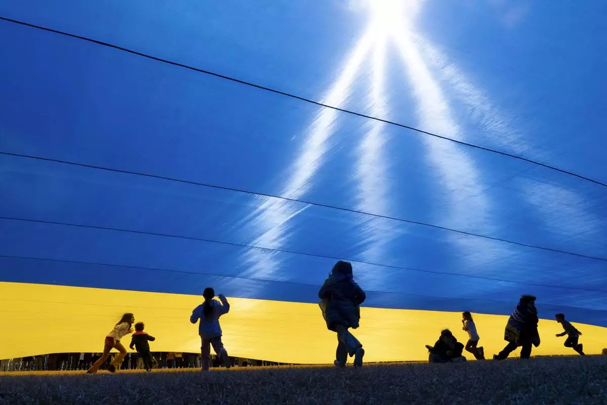 Children play under an Ukrainian flag as demonstrators rally in support of Ukraine at The Ellipse near the White House in Washington, Saturday, March 8, 2025. (AP Photo/Jose Luis Magana)