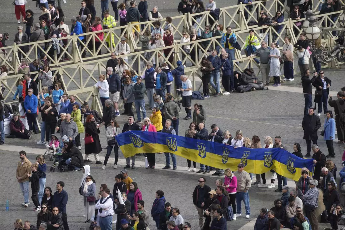 Faithful hold Ukrainian national flags as Cardinal Michael Czerny, prefect of the Dicastery for Promoting Integral Human Development, and delegate of Pope Francis celebrates a mass for the members of the world of volunteers in St. Peter's Square at The Vatican, Sunday, March 9, 2025. (AP Photo/Gregorio Borgia)