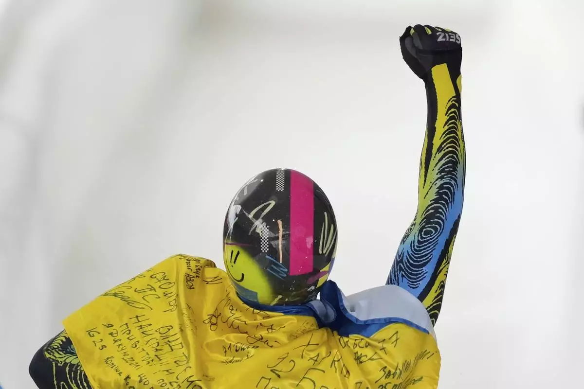 Vladyslav Heraskevych, of Ukraine, reacts after finishing his fourth run at the skeleton world championships, Friday, March 7, 2025, in Lake Placid, N.Y. (AP Photo/Julia Demaree Nikhinson)