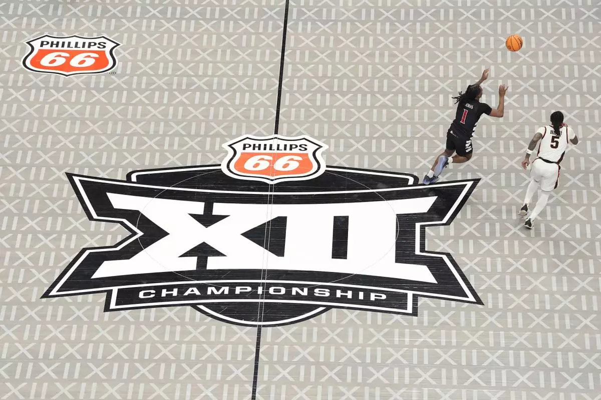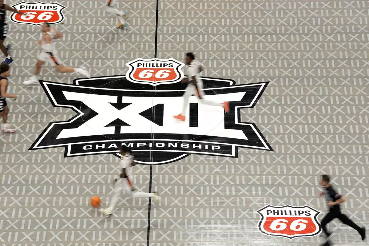 The Big 12 logo is seen on the court during the second half of an NCAA college basketball game between Cincinnati and Oklahoma State in the first round of the Big 12 Conference tournament, Tuesday, March 11, 2025, in Kansas City, Mo. (AP Photo/Charlie Riedel)