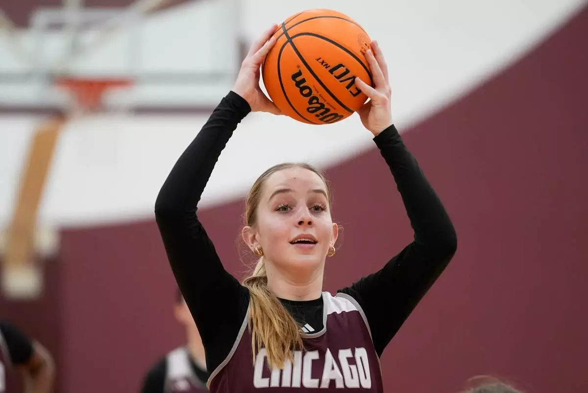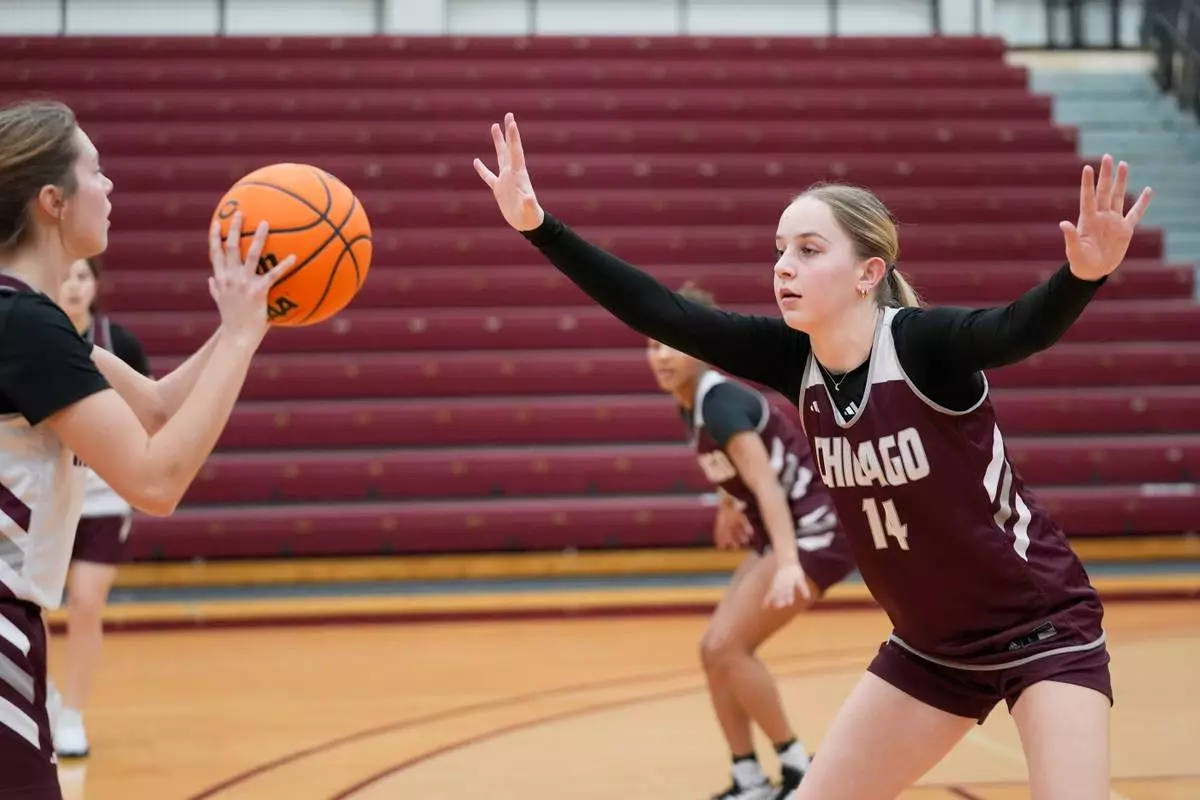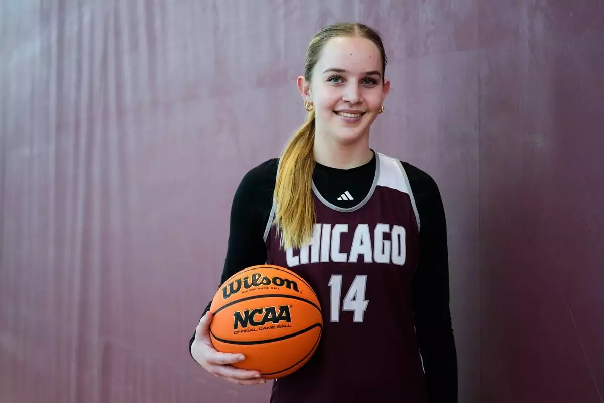 University of Chicago freshman Annabelle Spotts, one of six women from Kobe Bryant’s Mamba Academy going through their first experience with college basketball, poses during NCAA college basketball practice, Friday, Feb. 28, 2025, in Chicago. (AP Photo/Erin Hooley)