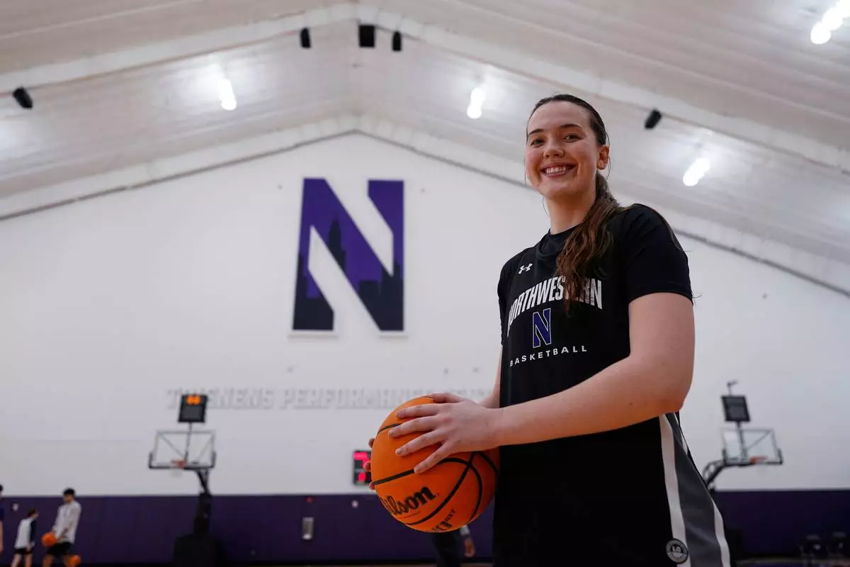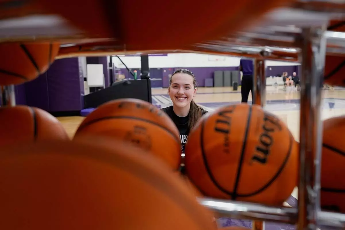 Northwestern freshman Kat Righeimer, one of six women from Kobe Bryant’s Mamba Academy going through their first experience with college basketball, poses for photo during NCAA college basketball practice in Evanston, Ill., Tuesday, Feb. 25, 2025. (AP Photo/Nam Y. Huh)
