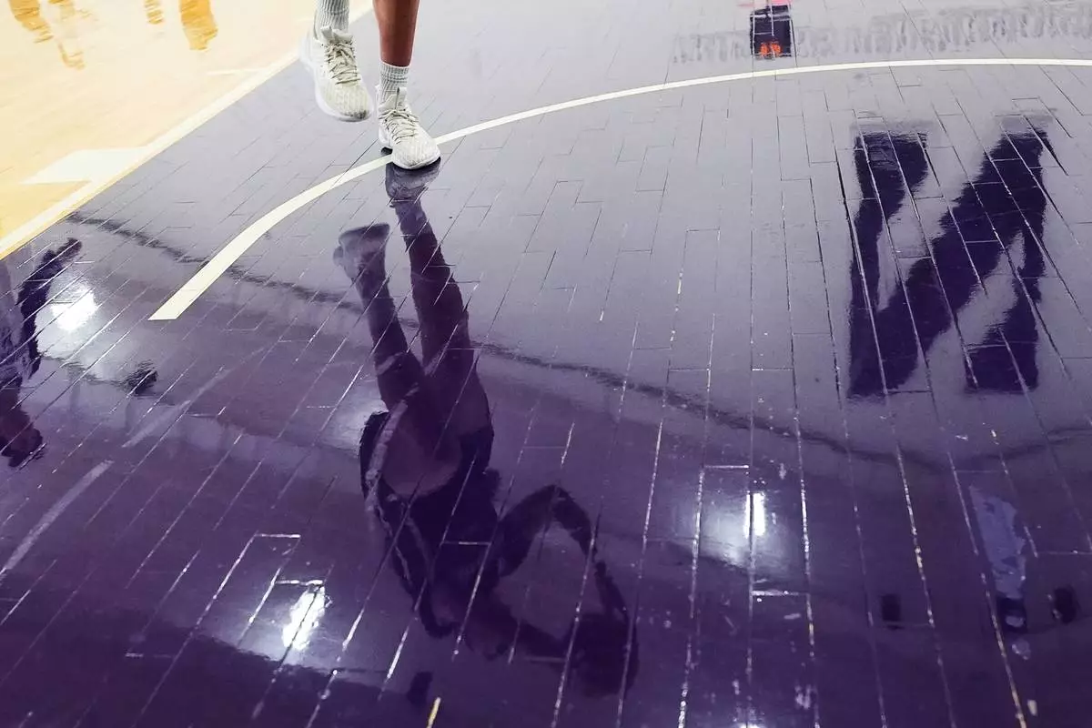 Northwestern freshman Kat Righeimer, one of six women from Kobe Bryant’s Mamba Academy going through their first experience with college basketball, is reflected on the court as he drives to the basket during NCAA college basketball practice in Evanston, Ill., Tuesday, Feb. 25, 2025. (AP Photo/Nam Y. Huh)